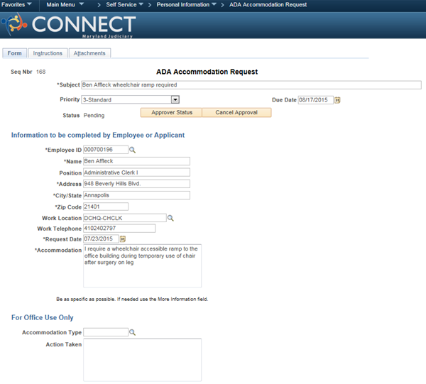 The ADA Accommodation Request is an online form required to submit your request to the ADA Coordinator. An approval process workflow allows requestors and approvers to see where the request is in the approval process.